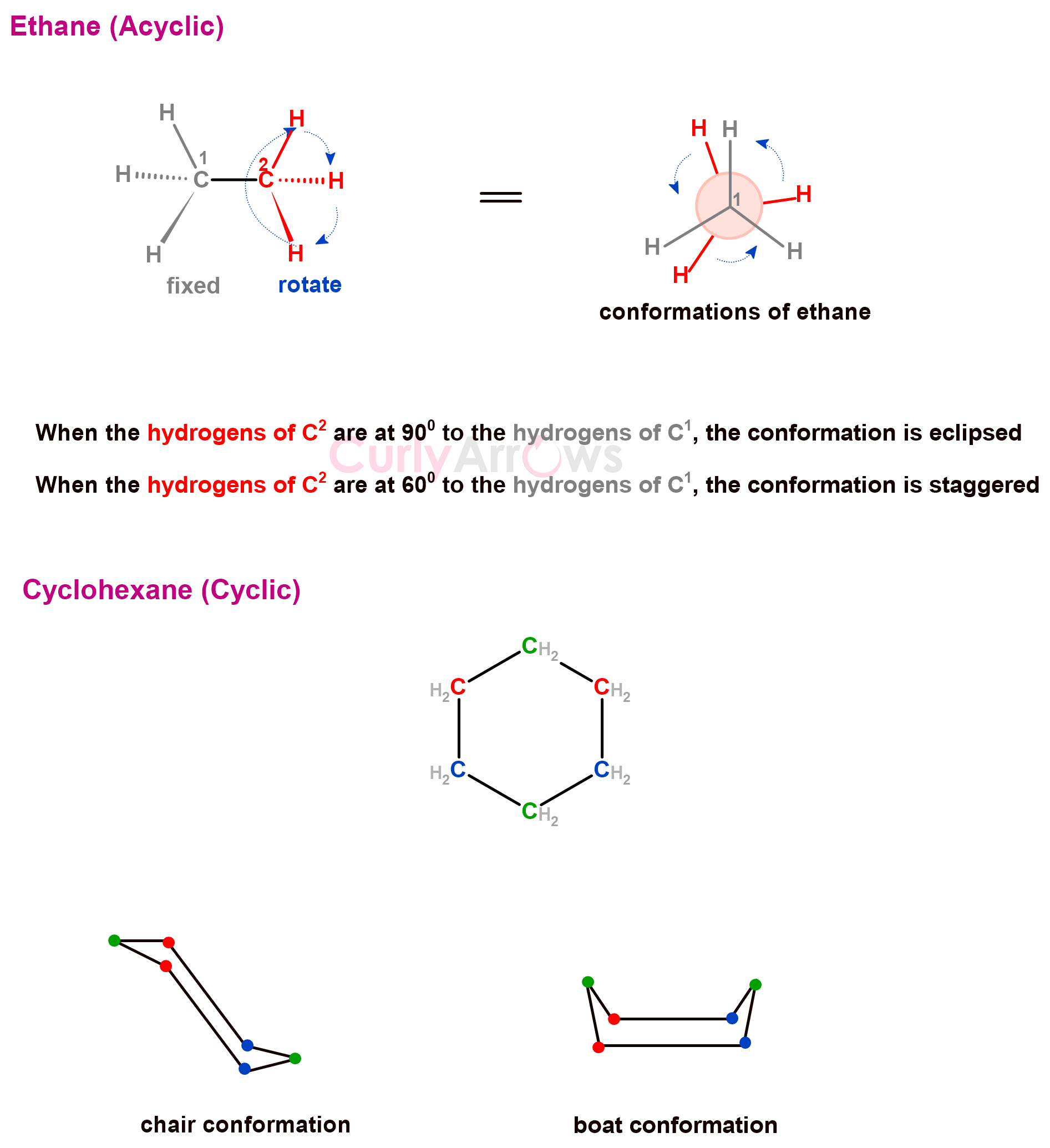 Conformations can be formed by open-chain (acyclic) or closed-chain (cyclic) carbon compounds. Examples of some common conformations adopted by carbon-carbon single bonds containing organic molecules are- eclipsed, staggered, gauche, planar, boat, and chair conformations.